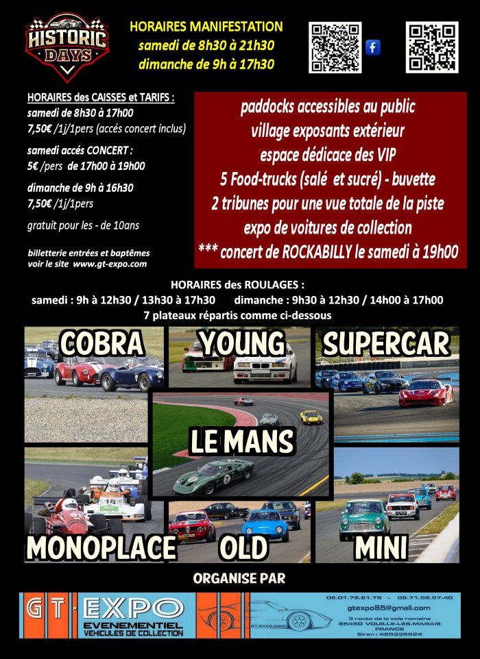 2 jours de roulage/démonstration de véhicules Historiques et sportifs des années 50's à aujourd'hui. l’exclusivité HISTORIC DAYS est que 2 plateaux sont spécifiquement dédiés aux Cobra, GT40, cobra DAYTONA, avec un plateau LEMANS regroupant les véhicules iconiques des années 60/70 (Porsche, Corvette, Lola, Mc laren, etc...) Et pour compléter cette exclusivité, nous aurons la présence de GENTLEMAN CAR, l’importateur officiel SHELBY Europe, qui nous amènera un large éventail de véhicules prestigieux, présentés dans des véhicules eux aussi exceptionnels. Les pilotes et spectateurs viennent de toute la France (et pays limitrophes) c'est 7000 à 10.000 spectateurs attendus sur les 2 jours. |